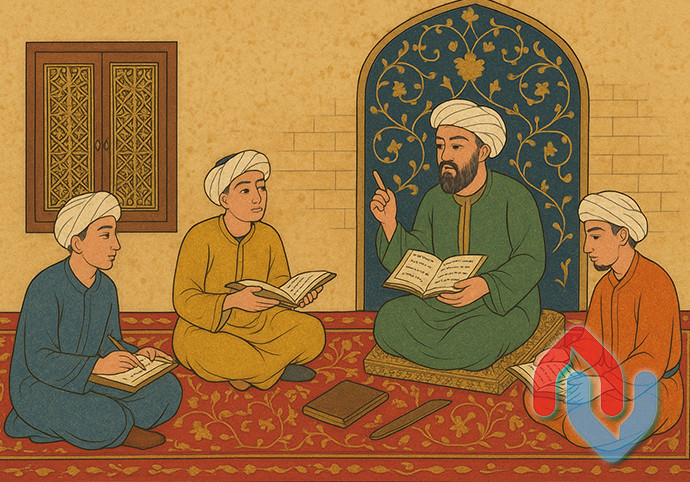 Klassik İslam miniatür üslubunda hazırlanmış bu illüstrasiya, məsciddə bir müəllimin şagirdlərinə Quran və yazı öyrətdiyi səhnəni təsvir edir. ( Süni intellekt)