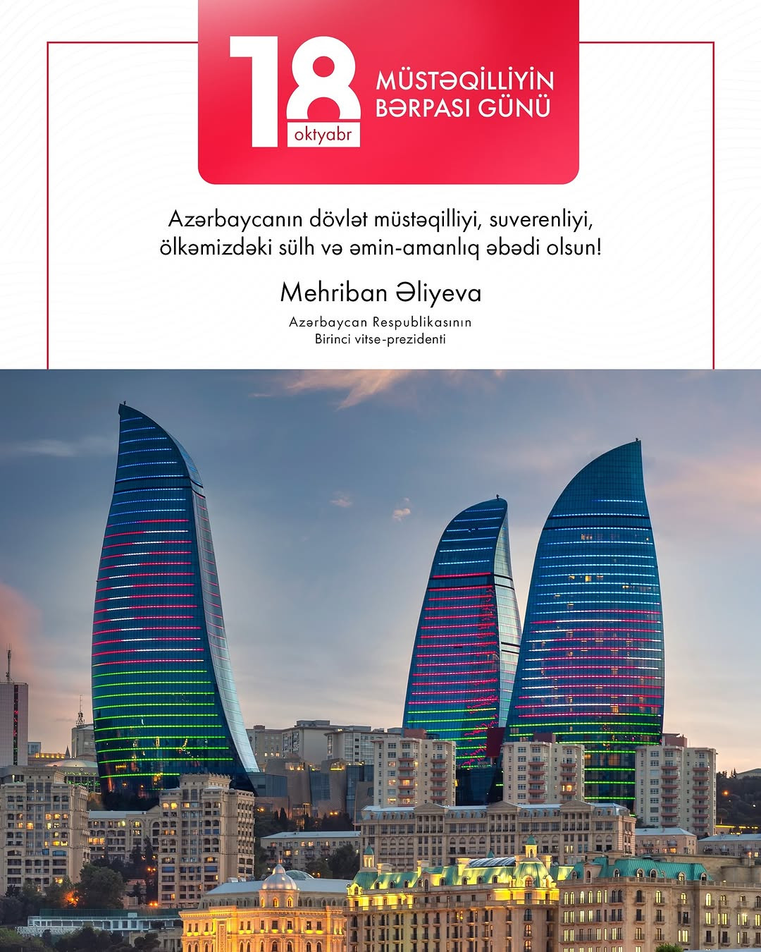 Facebook Twitter LinkedIn Pinterest Email Bakı, AzerVoice Azərbaycanın Birinci vitse-prezidenti Mehriban Əliyeva Azərbaycanın Müstəqilliyinin Bərpası Günü ilə əlaqədar paylaşım edib. AzerVoice paylaşımı təqdim edir: #Mehriban Əliyeva Facebook Twitter Pinterest LinkedIn Tumblr Email Copy Link Oxşar Xəbərər Birinci vitse-prezident Mehriban Əliyeva Azərbaycanın Müqəddəs Taxt-Tacdakı səfirliyinin inzibati ofisinin açılışında iştirak edib 18 Oktyabr 2025 12:14 Zəfər xronikası. 18 oktyabr 2020-ci il: Birinci vitse-prezident Mehriban Əliyeva Füzulinin işğaldan azad edilməsi ilə bağlı paylaşım edib (FOTO) 18 Oktyabr 2025 08:00 Birinci vitse-prezident Mehriban Əliyevanın Vatikan şəhər-dövlətinin qubernatorluğunun prezidenti ilə görüşü olub 18 Oktyabr 2025 00:15 Birinci vitse-prezident Mehriban Əliyeva Vatikanın dövlət katibi ilə görüşüb 17 Oktyabr 2025 23:33 Birinci vitse-prezident Mehriban Əliyeva Roma Papası XIV Leo ilə görüşüb 17 Oktyabr 2025 19:41 Birinci vitse-prezident Mehriban Əliyeva Vatikanda Müqəddəs Pavel Bazilikasının baş keşişi ilə görüşüb 16 Oktyabr 2025 22:56 Vatikanda Müqəddəs Komodilya katakombalarının bərpası layihəsinin açılışı olub Azərbaycanın Birinci Vitse-prezidenti Mehriban Əliyeva açılış mərasimində iştirak edib 16 Oktyabr 2025 22:51 Zəfər xronikası. 11 oktyabr 2020-ci il: Birinci vitse-prezident Mehriban Əliyeva Ermənistanın Gəncə şəhərinə raket hücumu ilə bağlı paylaşım edib 11 Oktyabr 2025 08:23 Zəfər xronikası. 4 oktyabr 2020-ci il: Birinci vitse-prezident Mehriban Əliyeva ordumuzun cəbhədə qazandığı qələbələrlə bağlı paylaşım edib 4 Oktyabr 2025 08:00 Birinci vitse-prezident Mehriban Əliyeva Cabir İmanovun vəfatı ilə bağlı paylaşım edib 29 Sentyabr 2025 17:25 Zəfər xronikası. 29 sentyabr 2020-ci il: Birinci vitse-prezident Mehriban Əliyeva rəsmi "İnstagram" səhifəsində paylaşım edib 29 Sentyabr 2025 08:11 Birinci vitse-prezident Mehriban Əliyeva 27 Sentyabr - Anım Günü ilə əlaqədar paylaşım edib 27 Sentyabr 2025 00:15