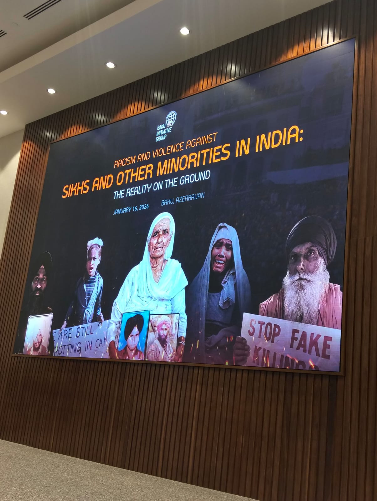 Konfrans Hindistan hökumətinin siqh xalqına qarşı həyata keçirdiyi repressiv tədbirləri, kütləvi qırğınları və zorakılıqları əks etdirən fotoşəkillərdən ibarət sərgi ilə işinə başlayıb. Bildirilib ki, 1980–1990-cı illərdə Pəncab ştatında minlərlə siqh icması üzvü öldürülüb, oğurlanıb, məcburi şəkildə yoxa çıxarılıb və məhkəmə qərarları olmadan qondarma ittihamlarla qətlə yetirilib.