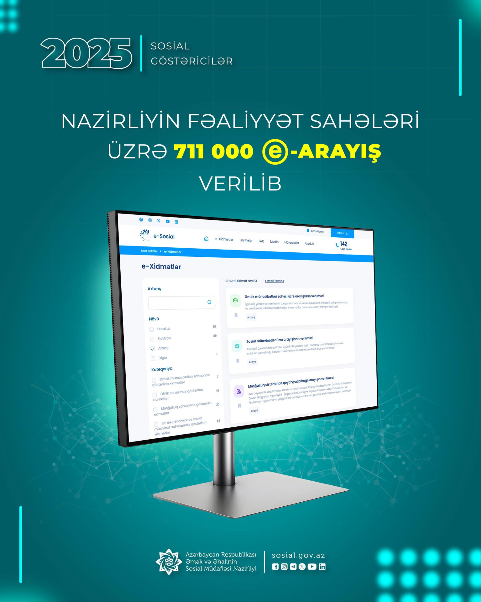 Bu e-xidmətlər vətəndaşlara iş yeri, əlillik, pensiya, müavinət, təqaüd, maddi yardım, ünvanlı yardım, dövlət tərəfindən mənzil və avtomobillə təmin edilmə, fərdi şəxsi hesab və s. barədə e-qaydada arayış əldə etməyə imkan verir.