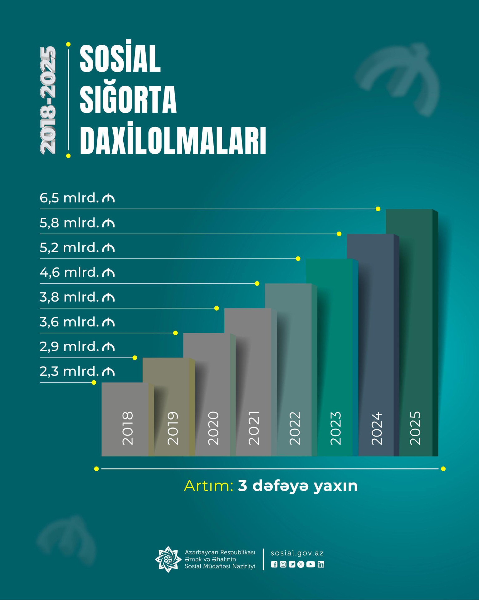 2018-2025-ci illərdə Fonda daxil olan sosial sığorta haqları üzrə illik vəsait 3 dəfəyə yaxın artaraq 2,3 mlrd. manatdan 6,5 mlrd. manata çatıb.