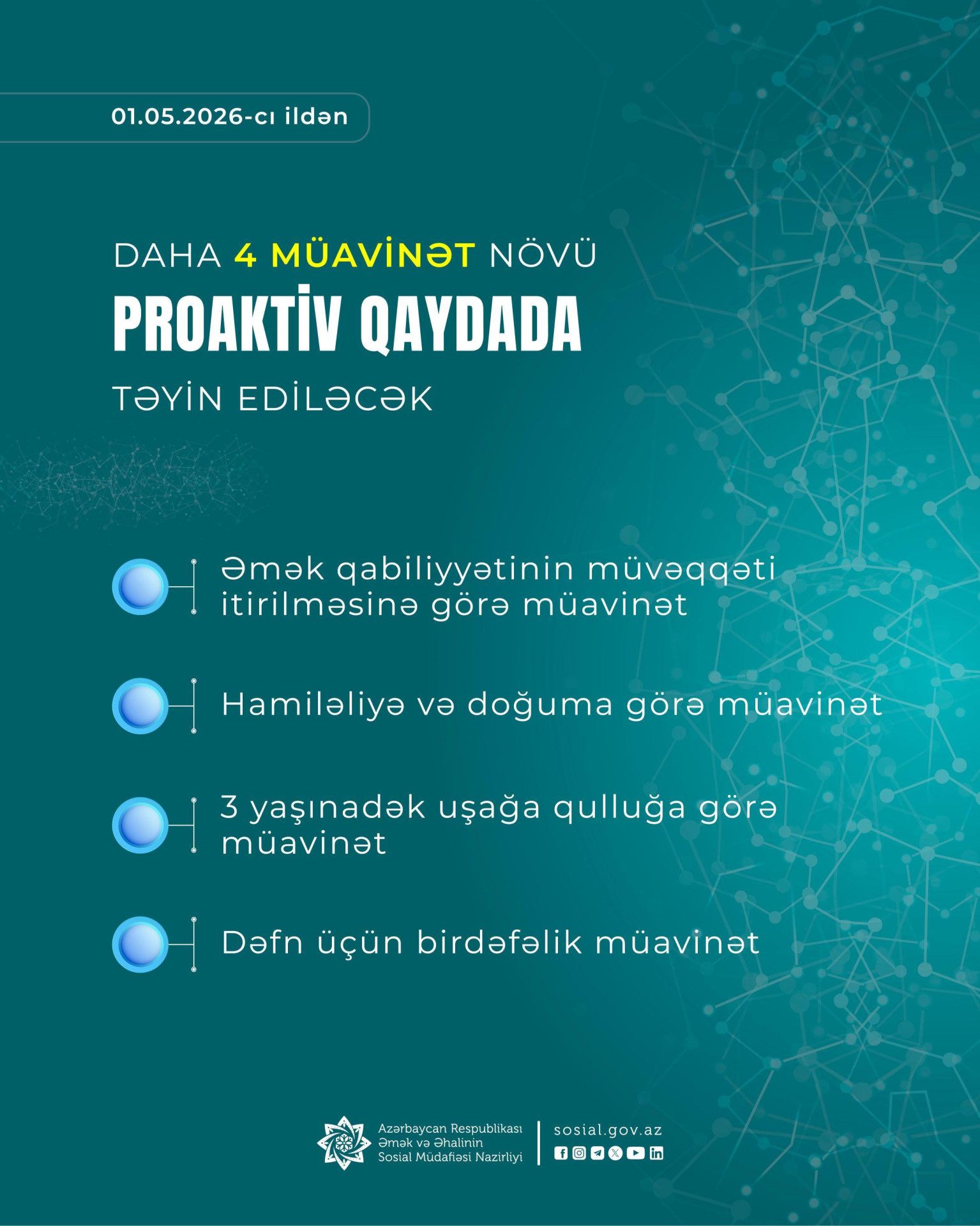 Məlumata görə, sözügedən müavinət növlərinin proaktiv qaydada təyin edilməsinə 2026-cı il mayın 1-dən etibarən başlanacaq.